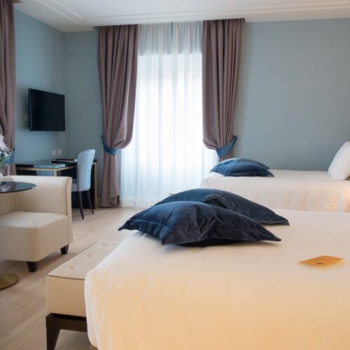 Les chambres du cinquième étage varient en superficie: de plus de 30 à 35 m²; les terrasses sont plus petites mais les vues sont plus belles; les salles de bains sont toutes dotées d’une grande douche. Chaque chambre est différente, mais elles sont toutes spacieuses, lumineuses et belles pour des séjours confortables et relaxants. Grand lit double 180×200 cm.